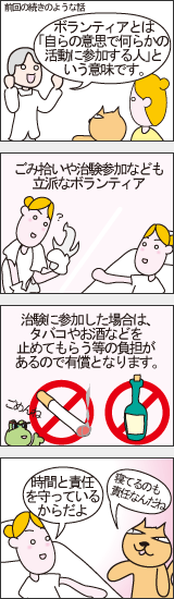 ボランティアに参加する人の中には「新しい薬を待ち望む人のために何かしたい」「社会貢献がしたい」と考えている方も、大勢いらっしゃいます。